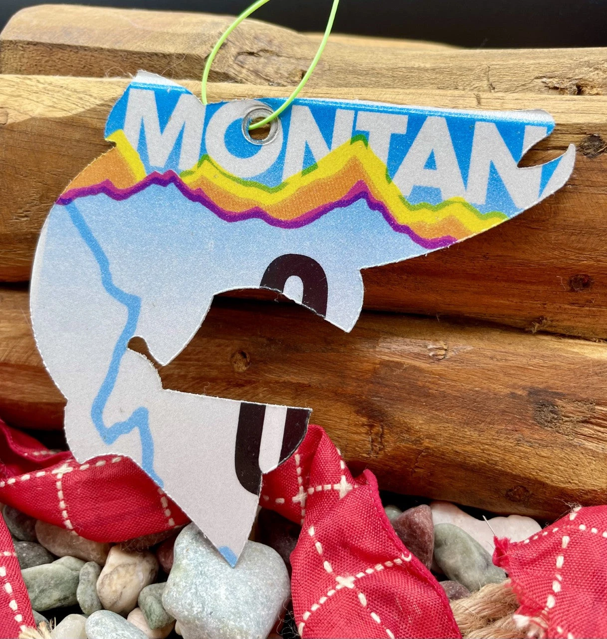 Compliment your holidays with a handmade Montana Colorful Jumping Trout ornament made out of authentic license plates. Each piece is artfully unique due to using a variety of license plates, and is tied with a colorful fly line. This is a great holiday ornament, gift accessory, or accent piece for the fishing enthusiast. These fish are a limited edition and sell fast, so please place your orders today.