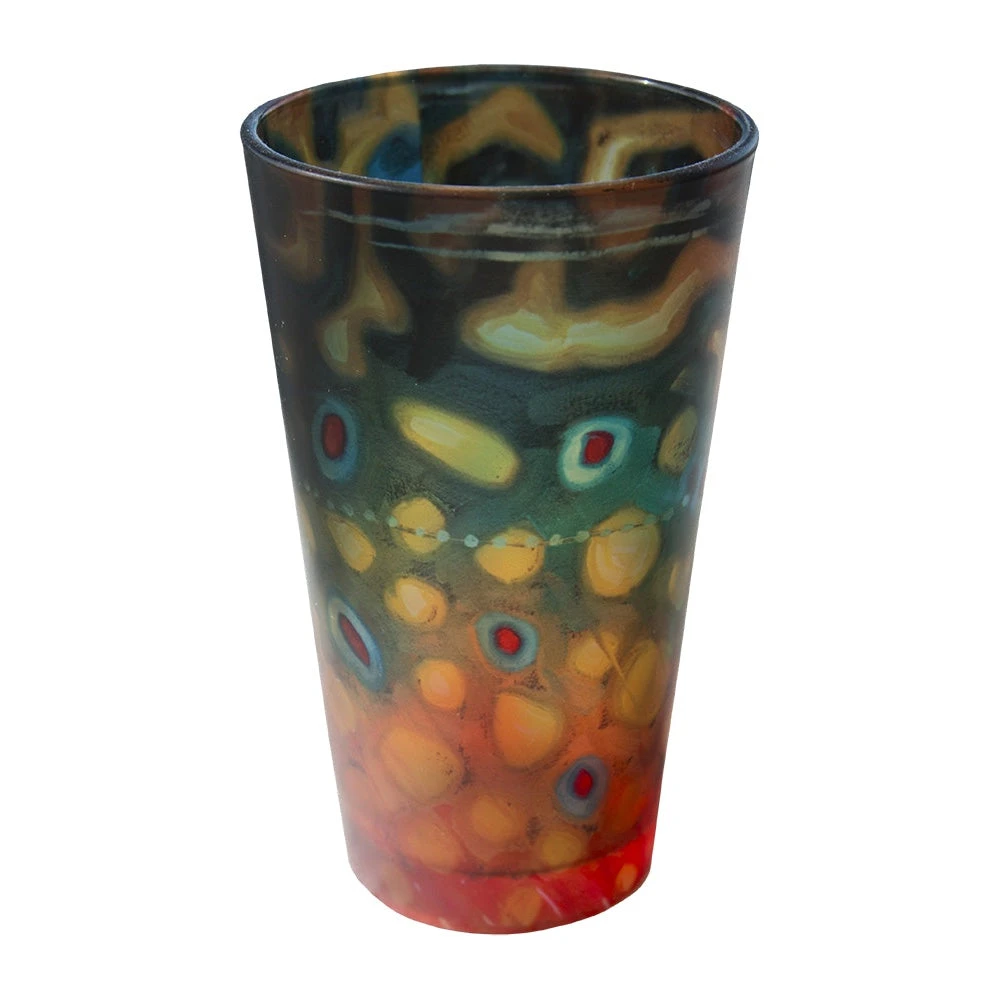 These heavy duty, 16 oz. Pilsner glasses showcase the best of DeYoung’s Abstract Fish Flank Series in a beautiful fully wrapped print within the glass. Available in Tarpon, Brown, Brook, Rainbow and Cutthroat. Buy as singles or as sets. Microwave safe, but not dishwasher recommended. Printed in the USA.