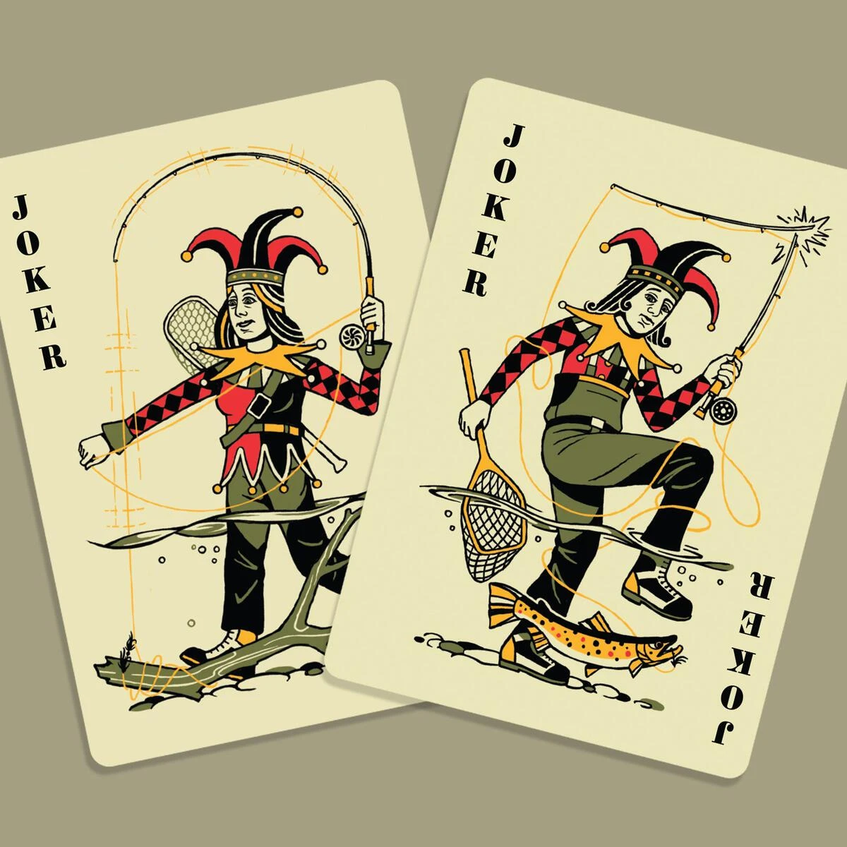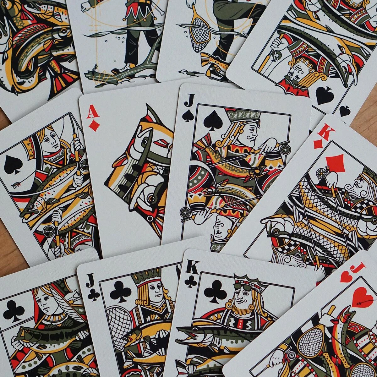 Back in October of 2021 I decided to draw a King of Hearts and see if there’s was interest in drawing a whole deck. After seeing the overwhelming response of people wanting to see the deck completed, I decided to say heck with it and jump in headfirst. For about a year and some change, I drew and designed every aspect of this deck. From the tuck box embellished with gold leaf and embossment, to the card backs, to the court cards and even down to subtle details in the symbols on the number cards, nothing on this deck was overlooked. This is the perfect deck to bring to camp, or play with friends or family on poker night, or gift to anyone you know who loves cards and fishing.