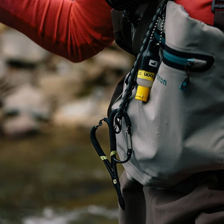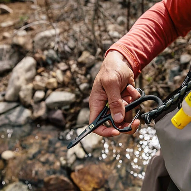 The ultimate mitten clamp, thoughtfully designed from the tips to the jaws to the handle. A carabiner handle means you can store anywhere and the tight angles and engineered shape accommodate all fly sizes, allow for easy hook removal, and can crimp even the heaviest of barbs. Oversized thumb and finger holes accommodate large or gloved hands, and the compact cutting surface easily clips light or heavy leader