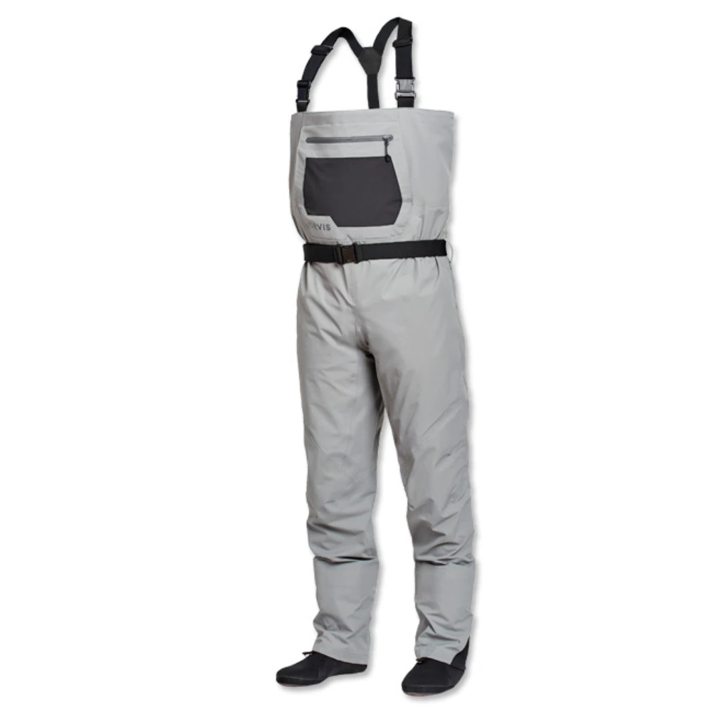 This new Clearwater fly-fishing wader for men is feature rich and built with a modern fit to eliminate traditional bulk. Four-layer waterproof breathable nylon fabric is light yet durable, with a 30K Waterproofness / 8K Breathability rating. Opposing side-release buckles allow for waist-high conversion on warm days. External storage pocket with stretch panel for small items and fly boxes, plus a kangaroo-style handwarmer pocket on the front chest. Updated anatomical neoprene booties with Integrated neoprene gravel guards to reduce water drag and collection. Low-profile seam construction and low-profile belt loops with 1½” webbing belt included. Hook and loop patch on interior pocket to attach Orvis waterproof pocket (8G3H sold separately). In stone. Nylon shell/ polyurethane membrane/Nylon tricot liner. Washable. Imported.
