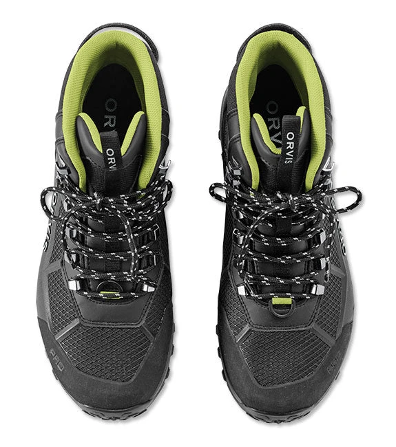 In an industry-first collaborative effort with Michelin, Orvis introduces the PRO Wading Boot. Built on an outsole compound specifically designed for fly fishing, this revolutionary new sole design is an industry disrupting advance in wet rubber traction. The Michelin Outdoor Extreme outsole offers 25% better abrasion resistance and a resounding 43% improvement in wet rubber traction. Using Michelin tire geometry, it offers a wider footprint for stability, a higher ratio of surface contact, and a lug pattern that reduces shock and improves pressure distribution. The two-layer midsole has a co-molded ESS plate that provides improved stud retention and torsional stability. The shock absorbing Phylon midsole improves “river feel” and compresses less than standard EVA midsoles. Orvis partnered with Ortholite to create a 3D molded X25 insole designed for high-impact sports, delivering maximum comfort and arch support. An industry first cast PU upper eliminates seams while providing a zoned cage for added stability, grip, and extreme abrasion resistance without the added bulk. The boot is higher cut for ankle support and lined with closed-cell foam. Scratch rubber at the toe cap and heel for abrasion resistance, an oversized heel pull for easier on-and-off, and tightly woven laces reduce broken laces. Imported.